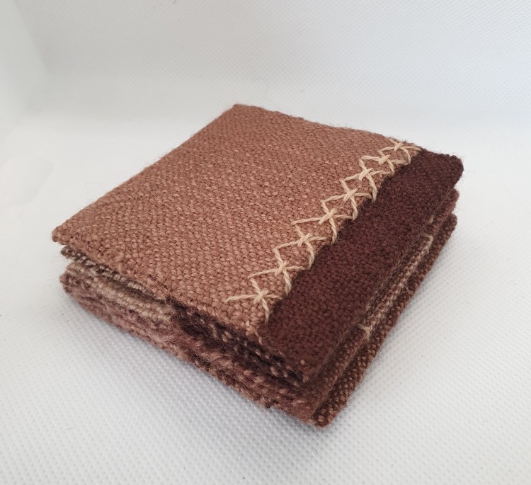 I have finished weaving a couple more of the double weave accordion books, one with four sections and one with six. Handwoven using 2 ply corriedale yarn dyed with harakeke seedpods, the books are fun to play with and rearrange into new shapes.