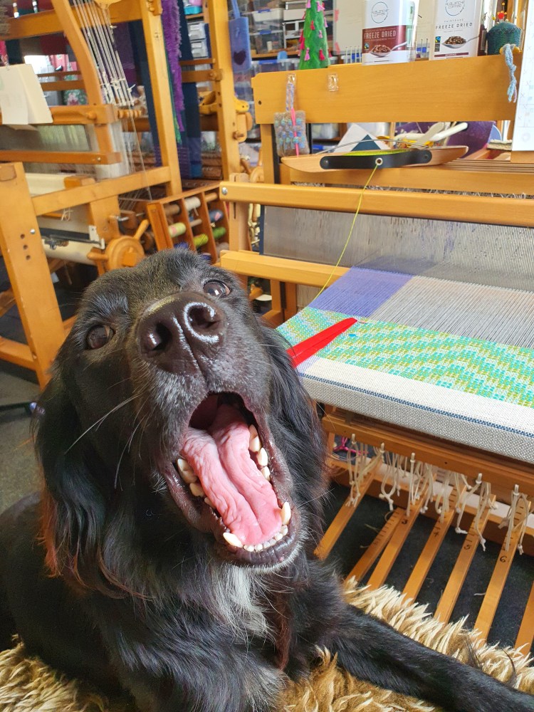 Rufus is mostly banished from my weaving studio as he has a tendency to stealthily pick up yarn and other things and head outside to chew them. I relent every now and again and let him in, and he behaves himself for a bit, then he gets bored and starts looking for trouble. Here’s a picture of him busy telling me it’s time to stop weaving and go outside and play.