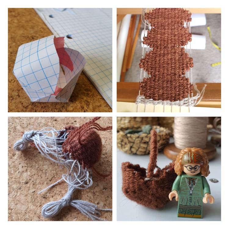 I have also been experimenting with pulled warp technique, something I have wanted to try after reading an article on loom woven baskets in The Weavers Journal – Spring 1986 issue (you can find this issue here: https://www2.cs.arizona.edu/patterns/weaving/wj.html ) I put a narrow cotton warp on my table loom and used triple strands of 2 ply wool as the weft for an intial play. I made a couple of necklace pieces and then tried making a tiny basket which was fun though rather fiddly. I will put on a wider warp at some stage and try making a larger one.