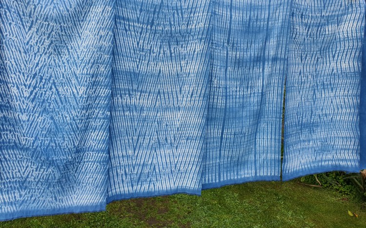 Last week I put a cotton warp on my Ashford jack loom and wove some woven shibori pieces using the techniques from Catharine Ellis’ book “Woven Shibori”. I wove four pieces with a cotton warp and two with a polyester weft. On Saturday my local weaving group had an indigo dyeing workshop and I dyed all the cotton weft pieces and one of the polyester weft pieces. I dyed both polyester weft pieces with Rit Dyemore dye as well and steamed them to set the pleats.