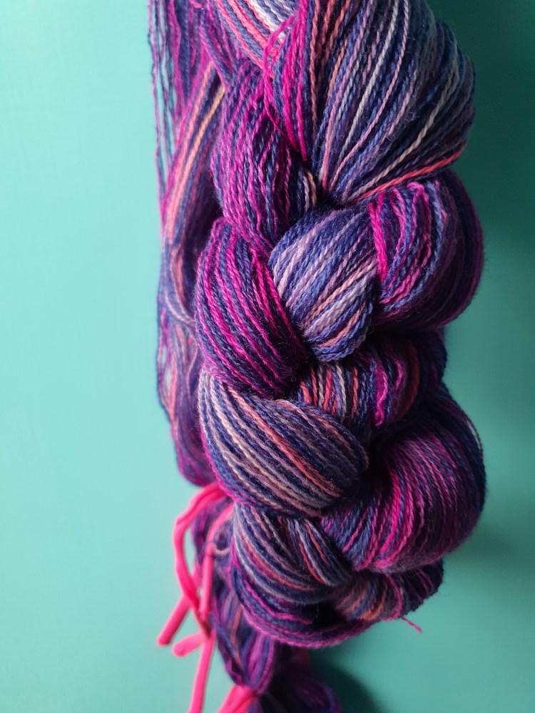 The photo is below is from the first dyeing session using my latest bath of dye. These yarns were all put in the dyepot at the same time and treated the same. You can see the difference you get from different fibres with this dye. From bottom to top the yarns are: rayon, tencel, acrylic knop yarn, “coconut cotton”(not sure what this actually is) and corriedale wool.
