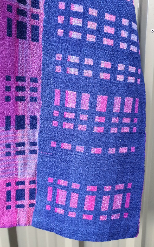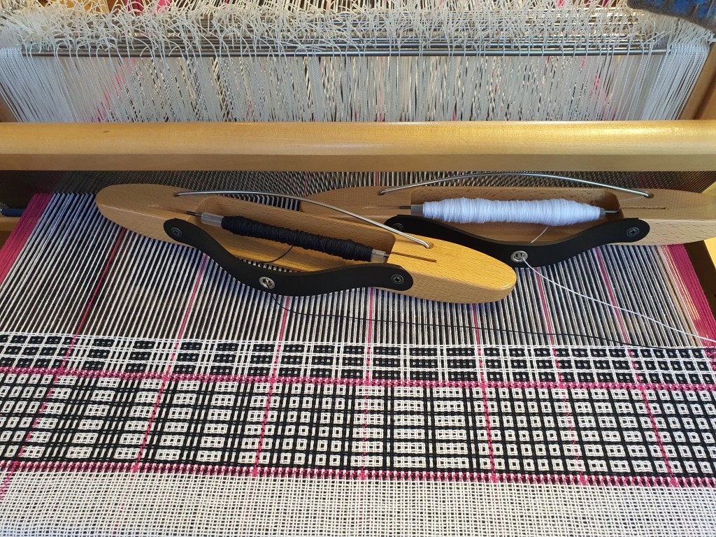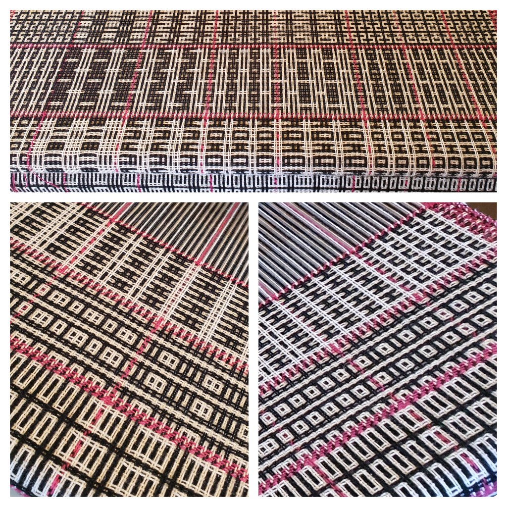 Continuing to weave the Deflected Double Cloth sample blanket from Exploring Woven Fabrics by Janet Phillips. I’m nearly halfway through and I’ve found that my understanding of this structure has definitely increased after working through the different lift-plans. Really looking forward to finishing this warp so I can plan some projects based on it.