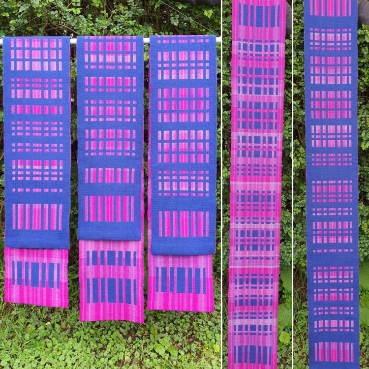 Once I had finished the samples I moved on to dyeing some more wool and warping up the loom for the final project. I cut the scarves off the loom on the last day of July, which was a relief as the exhibition they were for opened on the third of August. I’ll post some photos of the finished scarves in my next post.