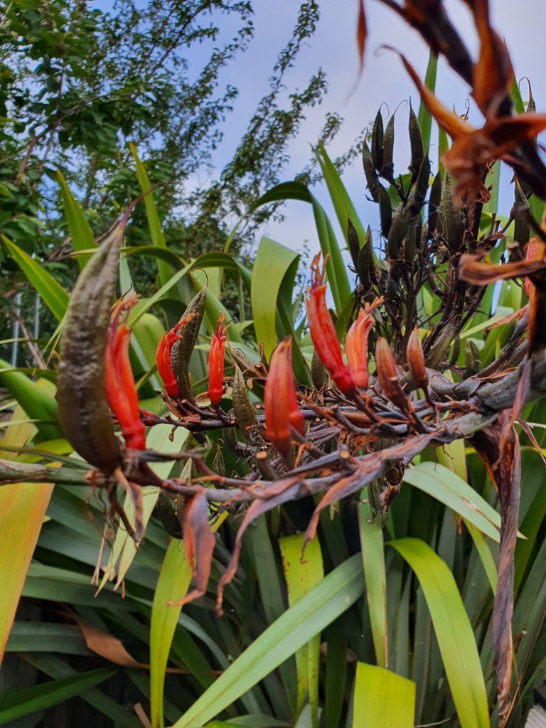 And today, I finally got around to cutting the kōrari (flower stalks) from the harakeke (NZ flax) plants in the garden and harvested the seedpods for a dyebath. The first photo below show the flowers and seedpods last month, the birds love feasting on the flowers. Once the flowers have died off the seedpods fully develop and usually I harvest them when they are still fresh but I left it later this year so most of the seedpods have dried off and split open to distribute their seed.