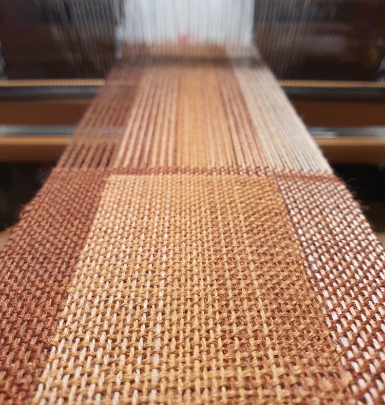 Weaving continues on the double weave warp on my table loom. The warp and weft is corriedale dyed with harakeke (NZ flax) seed pods.